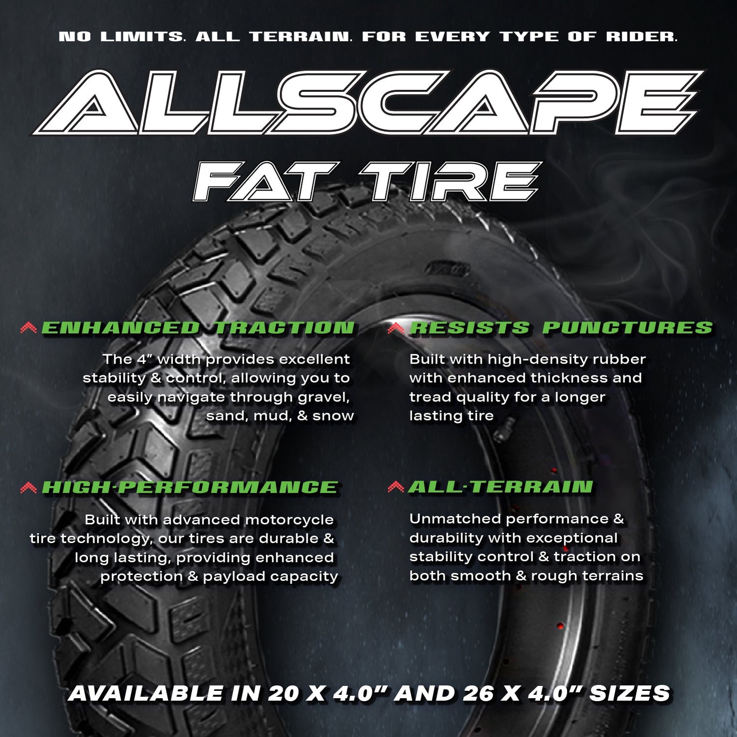 - EXTREME DURABILITY: Made with premium rubber and anti-puncture technology, our tire is built to withstand the toughest conditions. No more worries about frequent punctures and replacements. Our HEB ALLSCAPE 20x3 inch all-terrain fat tire will easily tackle every riding surface.